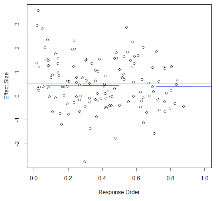 The apparent pattern is that the effect size was higher among the first 10% of respondents, and then relatively flat (or trending slightly downward) among the rest of respondents. If we extrapolate the slight downward trend to fill in the missing data from nonrespondents (by fitting a linear regression line to everyone except the first 10%, as shown in blue), the implied effect size is 0.51 for the whole group of 196 participants who completed the pre-workshop survey, which is only slightly less than the observed 0.54 effect size for the 135 participants who took the post-workshop survey.10